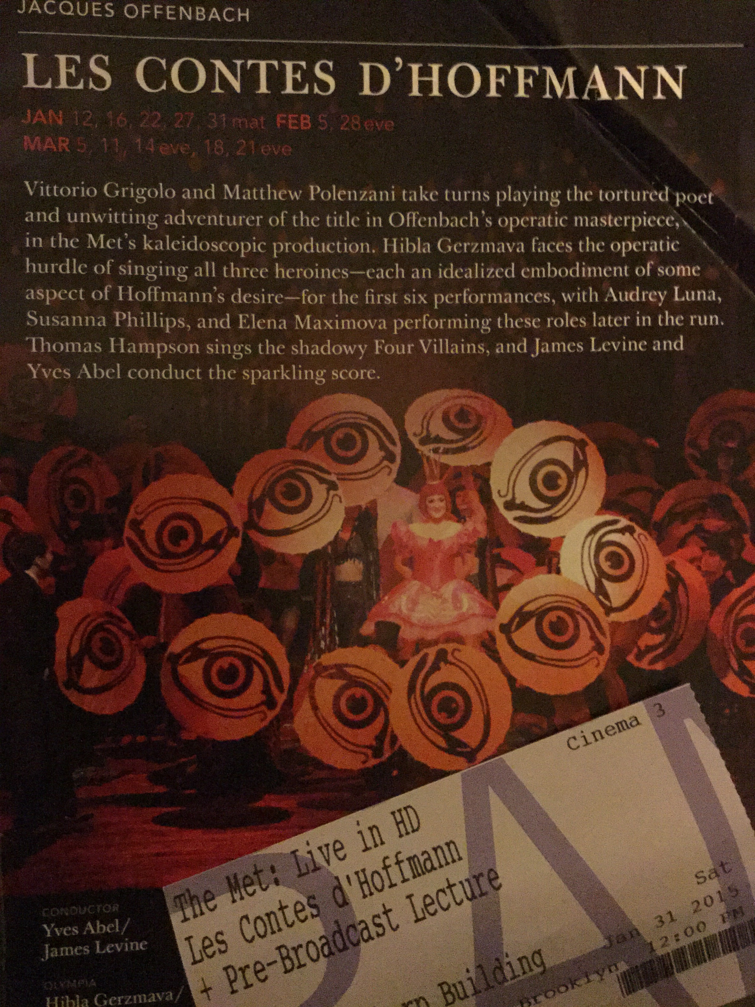 Should I see the performance live, or should I attend the Metropolitan Opera’s Live in HD screening at BAM’s Rose Cinema? Lucky for me I have the option. I usually do a little of both. There is nothing like the thrill of being in the opera house and hearing the music and voices live — no amplification. I have a voracious cultural appetite but I also need to pay the rent, so I am always in the Family Circle which is the Met’s equivalent of the boondocks — but no matter. I feel lucky that these affordable seats even exist. Today, however, I attended the screening of Les Contes d’Hoffmann at BAM, with the pre-broadcast lecture. How wonderful to hear an expert expound upon the history of the opera — the delicious little-known facts that really enhance the whole experience. Then, the live behind-the-scenes shots both before the opera begins and during intermissions. You see interviews with the performers, and watch the teamsters build the sets. It’s incredible. You also get to see the actual acting, dancing, costumes, and staging up close — so close that I have seen rips in costumes and wigs askew! Les Contes d’Hoffmann was a super choice to see in HD because the costumes and staging were so creative. In fact, the performance was downright erotic in a courtesan-meets-cabaret style. I learned from the lecture that Offenbach died before this, his only grand opera, was finished. I think this production would thrill him if he could experience it. As for me, I consider my Live in HD lecture and screening of this delightful opera a most excellent use of a bitterly cold afternoon.