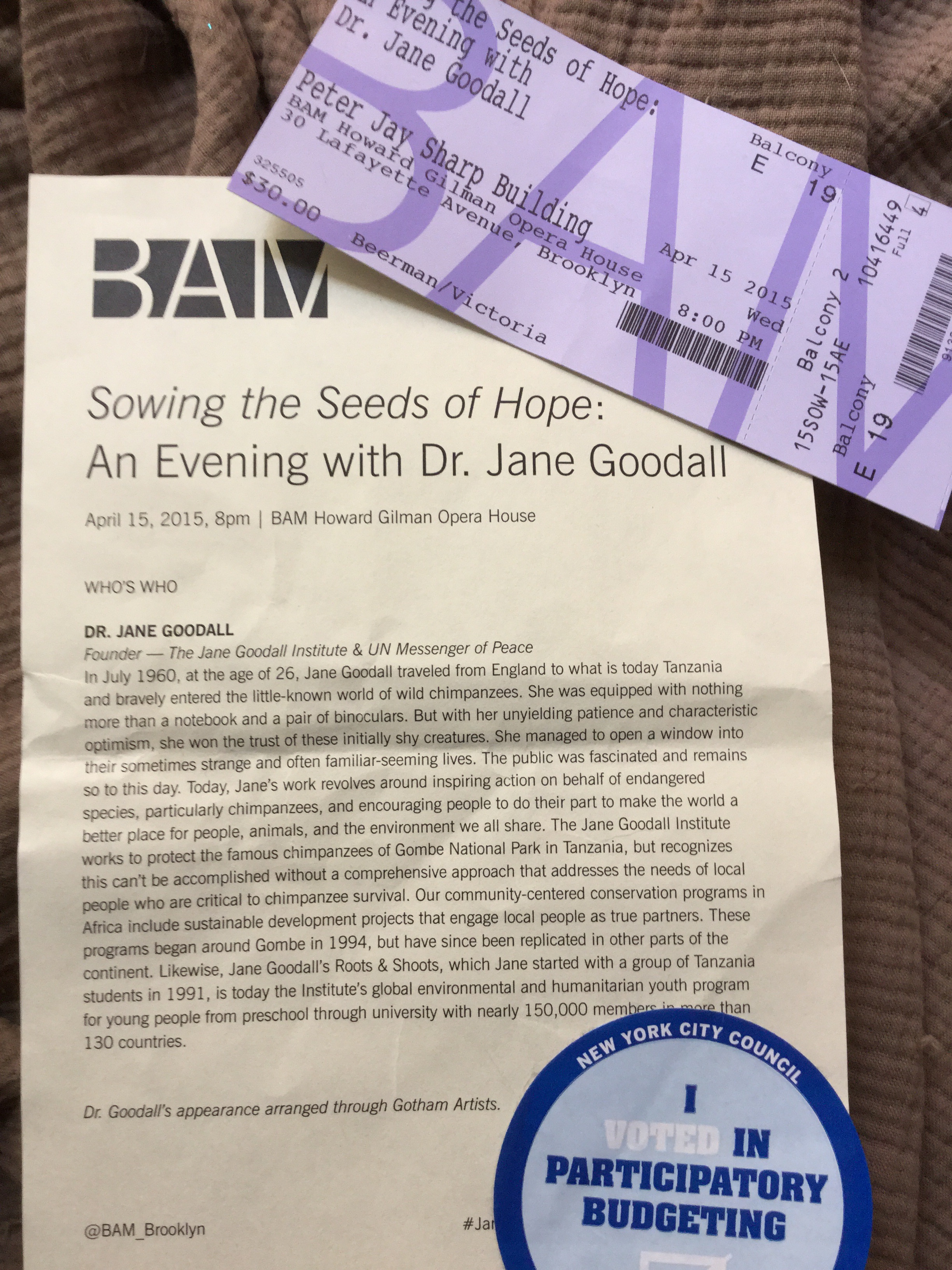 I spent a lovely evening at BAM hearing Dr. Jane Goodall speak about her life and her work. I was hoping she would speak about her childhood and the path that lead her to where she is now, and she did. It was very inspiring. Her mother encouraged her interests from a very young age, and whenever there was an opportunity, Dr. Goodall took it and used it to create the life she always imagined she’d have. She is the embodiment of “take what you have and make what you want.” Hearing her speak of her work with the chimpanzees of Gombe National Park in Tanzania, and watching the videos she showed of some of those experiences, touched me very deeply and often brought tears to my eyes. Her work with youth around the world in her Roots & Shoots program is the perfect example of how all of us, working together, really can make a difference in our world. It was a real privilege to hear Dr. Goodall speak. I felt hopeful and empowered. Not long after, I was voting in my community’s participatory budgeting process and felt that same sense of hope and empowerment.